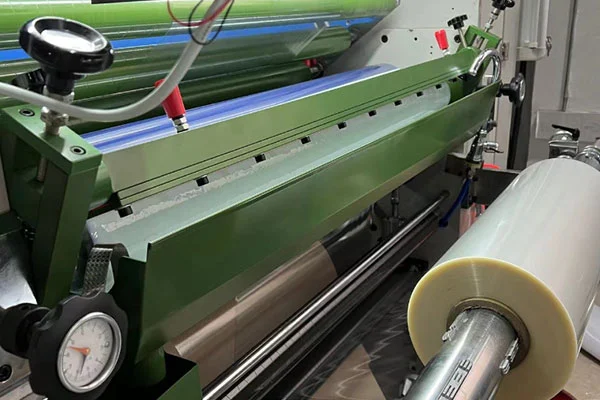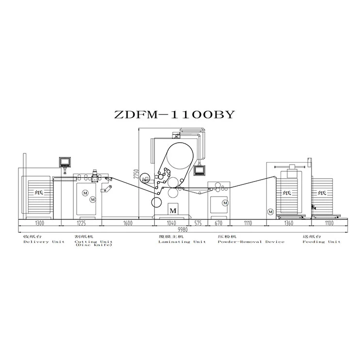 يتم نقل المادة المطبوعة إلى الموضع الأمامي المحدد بواسطة ناقل الورق ومن ثم يتم إدخالها. تتم تغذية الفيلم بواسطة جهاز التغذية، ثم يتم تغليفه بالغراء وتجفيفه. يتم ضغط الورق والفيلم بواسطة أسطوانة التسخين الكهرومغناطيسي وأسطوانة الضغط المطاطية ثم يتم تصفيحهما. قم بقص الجزء المتداخل من الورق باستخدام قرص السكين أو عجلة الورق الكاشطة وافصل الورق باستخدام بكرة سحب الورق. ومن ثم يتم إرسال المنتجات النهائية المنفصلة إلى نظام استلام وتكديس الورق الأوتوماتيكي في الحزام الناقل لتجميع المنتجات النهائية الفردية.